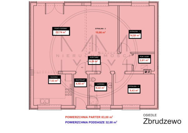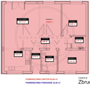 Powierzchnia domu to 83,00 m², w skład której wchodzą: