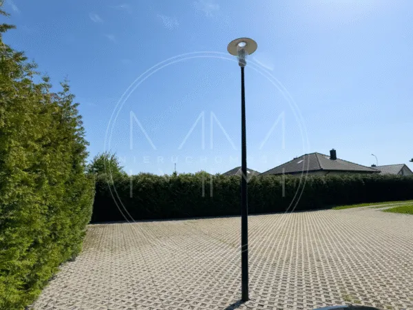 Na działce budowlanej wydłużonej nr 12/38 znajduje się oświetlony lampami ulicznymi parking, wyłożony w całości płytami betonowymi.
